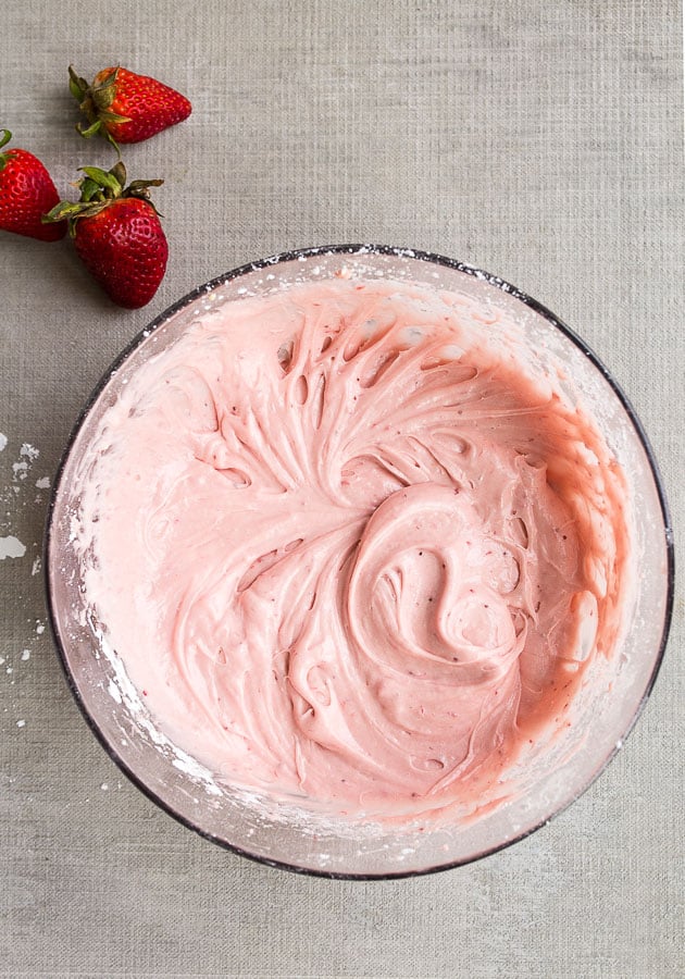 What makes this strawberry cream cheese frosting different is that itโs made with real strawberries. Now, there are recipes for frosting made with freeze-dried strawberries out there, but I donโt like to use those. One reason is because we snack on freeze-dried strawberries voraciously, and the bag hardly ever makes it home from the store. Yes, my daughter thinks freeze-dried fruit is candy, and if any of you tell her differently, Iโll find you.