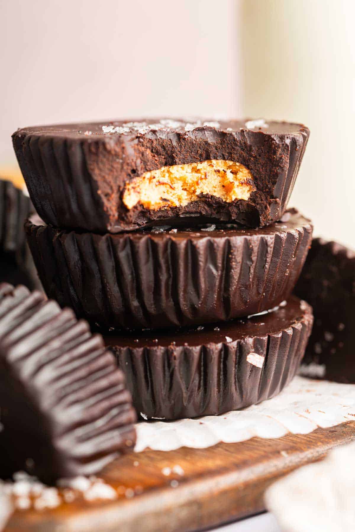 For these homemade peanut butter cups, I mixed my favorite creamy peanut butter with a small amount of powdered sugar and salt. Then, I use my homemade chocolate shell as the coating on the top and bottom.