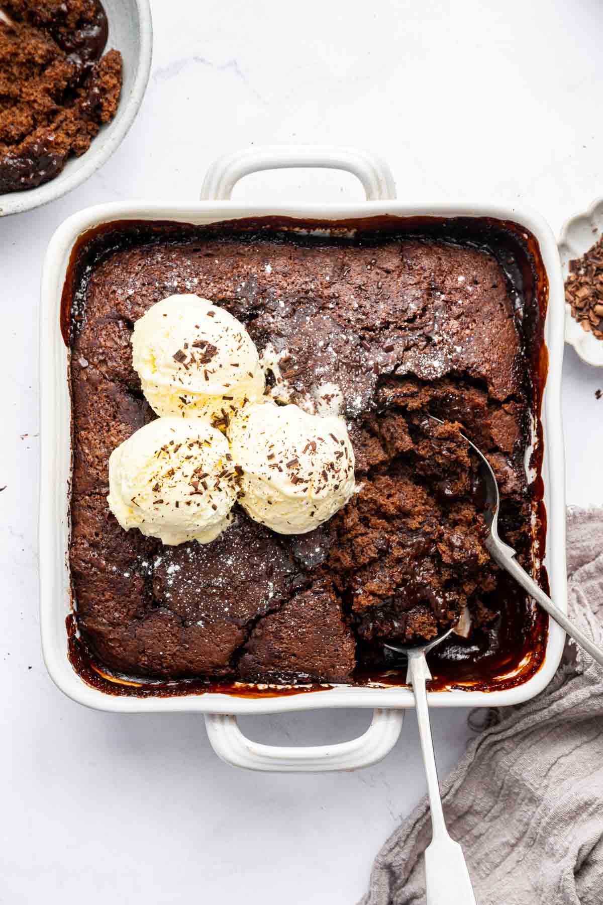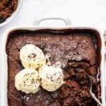 This recipe for chocolate cobbler is amazing served with vanilla ice cream, because the heat of the fudge sauce just begs for it. Warm chocolate cake with fudge sauce and ice cream is the literal definition of โbest chocolate dessert ever.โ