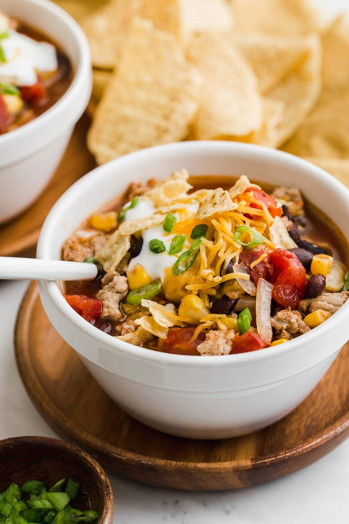 Ground Turkey: You can use any type of ground meat for this slow cooker taco soup: ground turkey, ground chicken, or even ground beef.