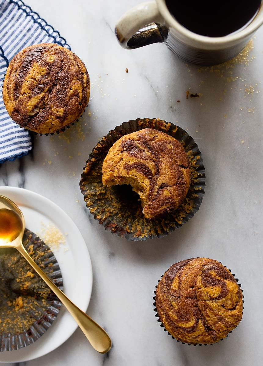 Made these a few days ago. I subbed canola oil for coconut oil as Iโm not a fan. They came out perfect. Thankfully only made 6 and I ate two 20 min out of the oven and a third later in the day. These are great. I like pumpkin muffins but sometimes itโs just too much pumpkin overload. These give you the pumpkin flavor with a swirl of chocolate goodness running through it. My new favorite muffin!